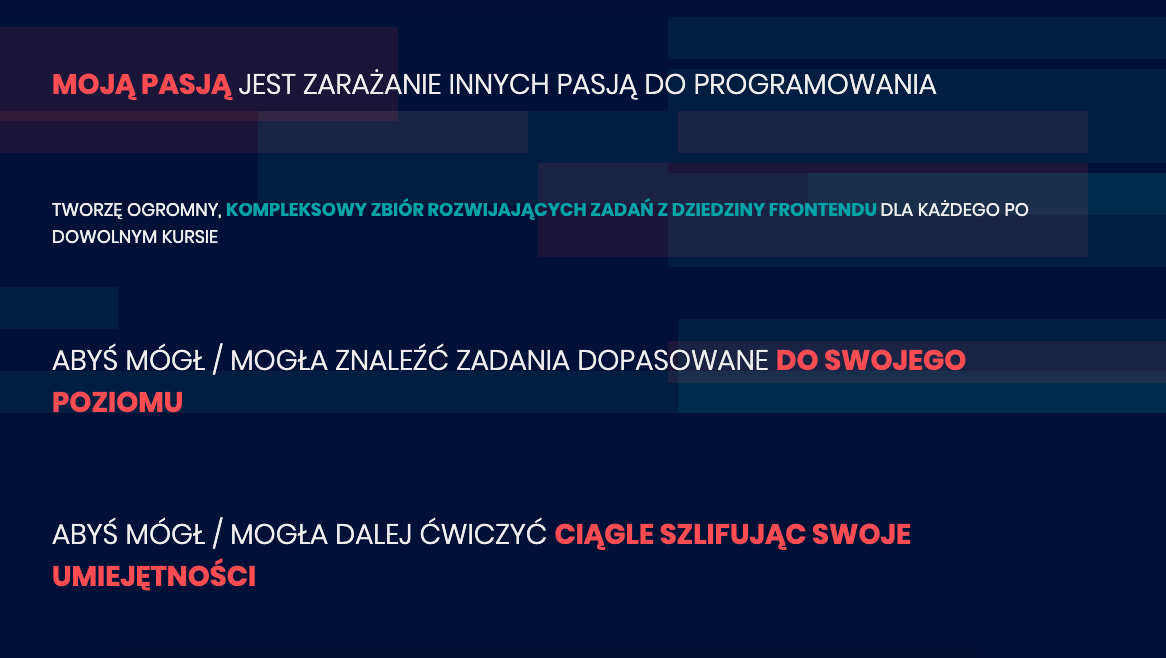 Systematycznie tworzę zbiory ambitnych zadań z HTML, CSS, JS, React i testów